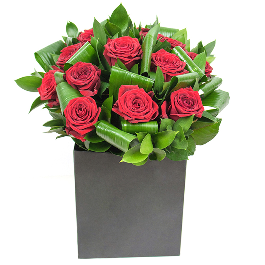 Illuminate your space with our radiant bouquet, featuring bright red roses, lush aspidistra leaves, and delicate ruscus. This unique floral design exudes elegance and style.