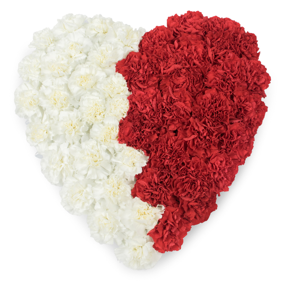 Immerse yourself in the luxurious charm of our heart-shaped carnation bouquet, expertly arranged by Handy Flowers. Featuring a rich blend of white and red carnations, this bouquet is a stunning expression of sympathy and affection.